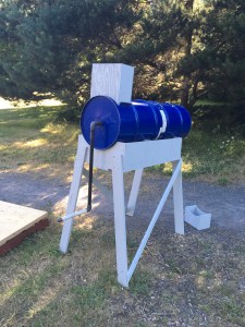 DIY insulated drum composter with a hand crank.