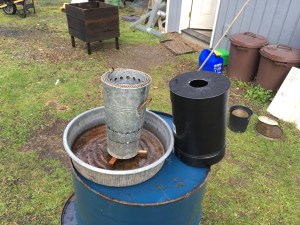 In trying to come up with better ways to make biochar at home I have been doing quite a bit of reading on “gasification” stoves. There are numerous youtube videos and articles on DIY Gasification camp stoves. A gasification stove differs from a normal combustion stove in that it is designed to generate heat at least in part by circulating the wood gas that is released from the fuel, combining the gas with oxygen and injecting it back into the combustion chamber. The result is supposed to be a cleaner more efficient burn with less harmful gasses and particulates exhausted into the environment. In addition, by burning the wood gasses from the fuel and not the wood itself I was intrigued by the possibility of using this kind of stove as a means to make biochar.