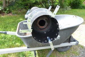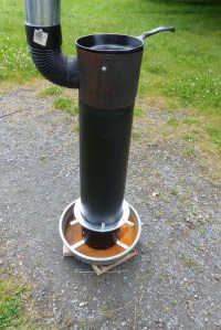I named this stove “The Rocket” because of its shape. While not a true rocket stove it does incorporate several rocket stove features like an insulated firebox and a tall vent stack. But the Rocket is actually a gasification biochar stove. It is lit from the top and the draft goes upward making it fit the description of a TLUD. The chief difference between this and earlier designs is the incorporation of a cook top in the venting system to use the waste heat from the bochar process to heat water or cook a small meal.
