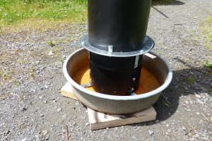 The concept is simple: make a small biochar stove and use the waste heat to cook with. As the diagram shows, this is achieved by simply putting a cook top on top of the stove. As this type of gasification stove doesn’t function well without a tall vent stack, the cooktop is raised two feet above the stove making it approximately three feet off the ground. Perfect height for cooking.