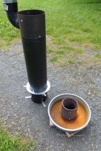- The pan and pot did not get as hot as I’d hoped. That is, the fire was hot enough but the heat transfer to the cooking vessel was not as efficient as it could have been. I suspect if I redesign the stove to put the riser closer to the bottom of the pan it would heat up faster.